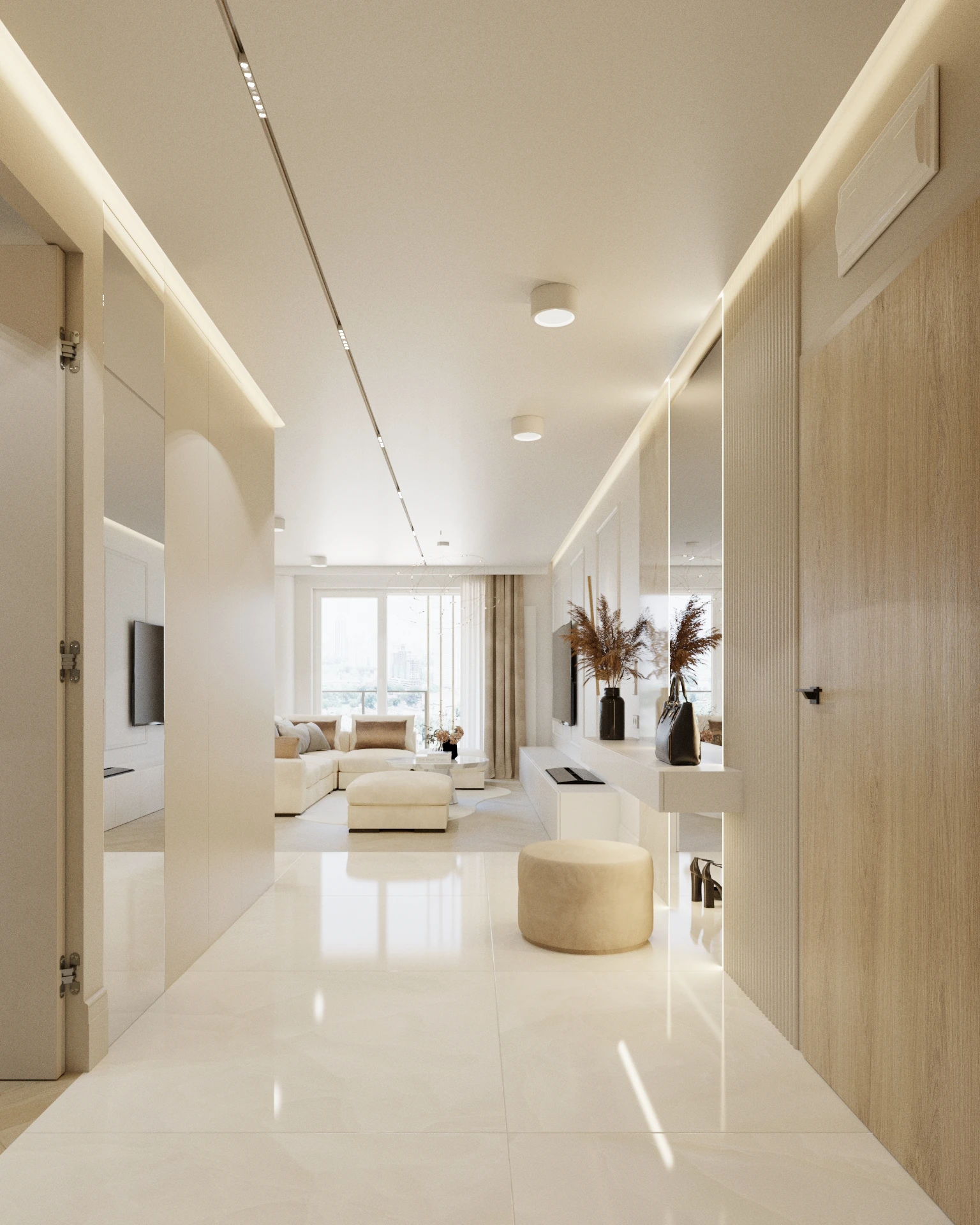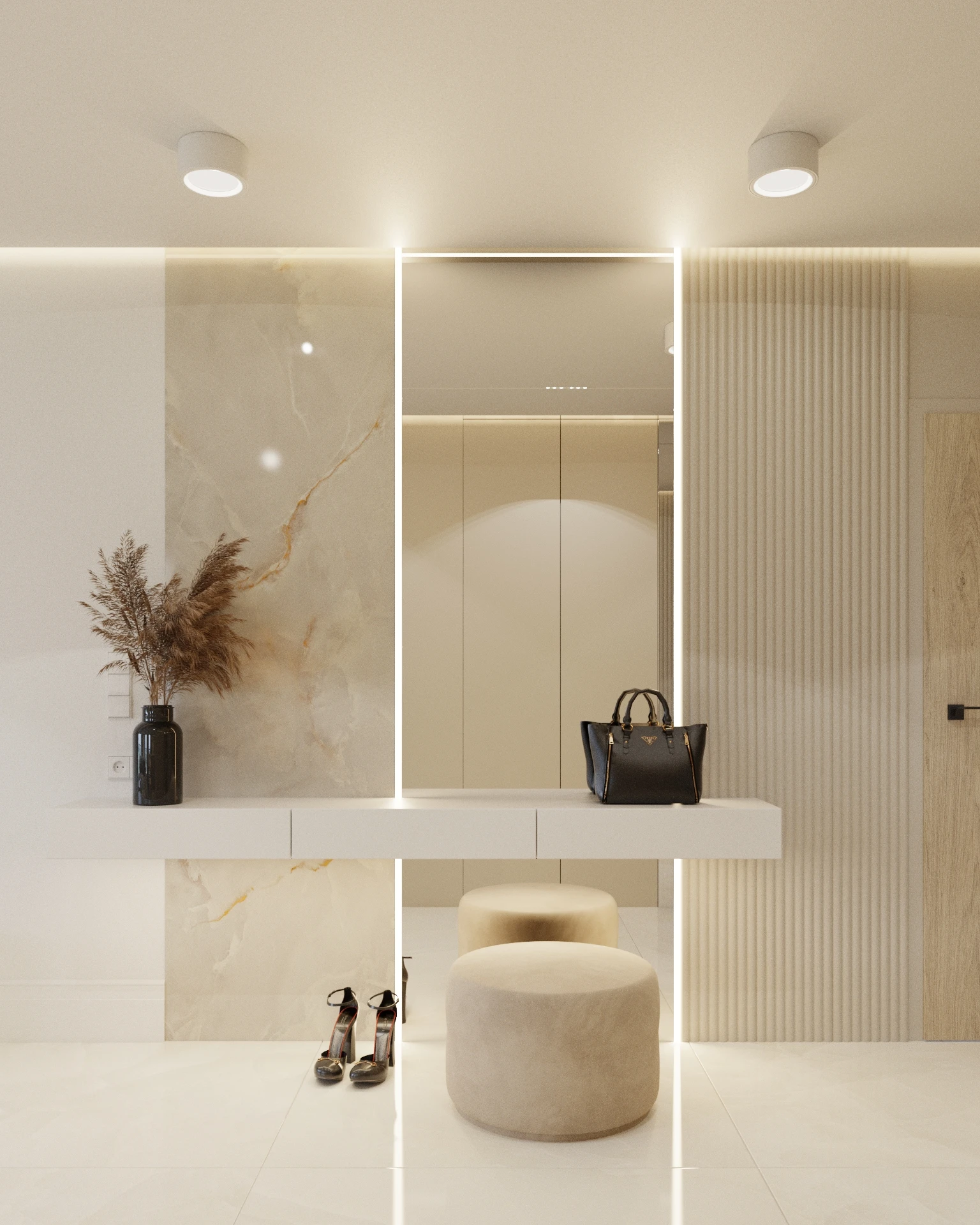 Aranżacja apartamentu opiera się na jasnej, świetlistej palecie barw, wzbogaconej o wyrafinowane detale. Motywem przewodnim, który wita nas już w holu i prowadzi przez kuchnię aż do łazienki, jest wielkoformatowa płytka z wzorem jasnego onyksu, nadająca wnętrzu spójność i elegancję. Stylistyka nawiązuje do klasyki w nowoczesnym wydaniu: ściany zdobią subtelne sztukaterie, a całość zyskuje charakter dzięki dodatkom w kolorze złota, które działają jak elegancka biżuteria dla wnętrza.