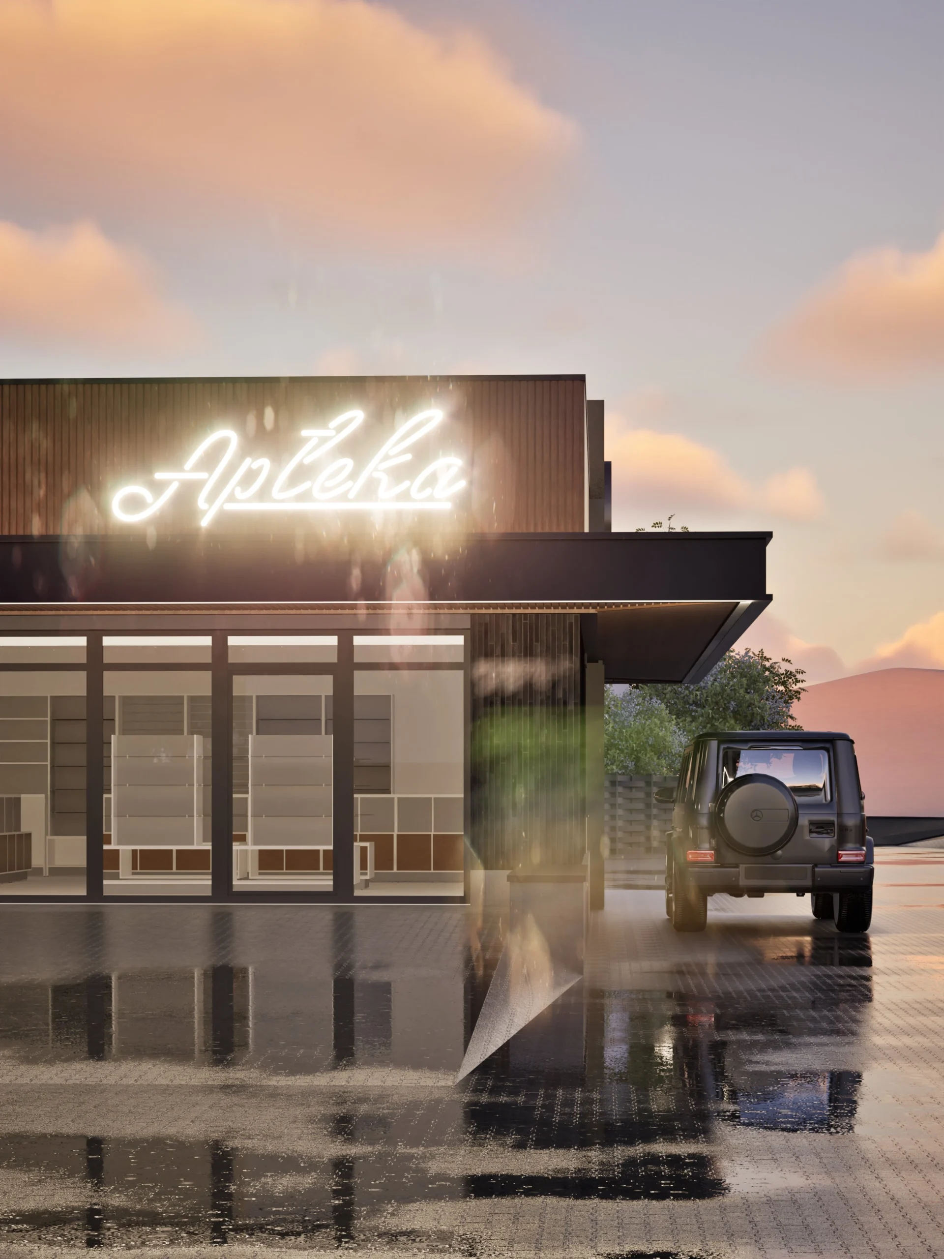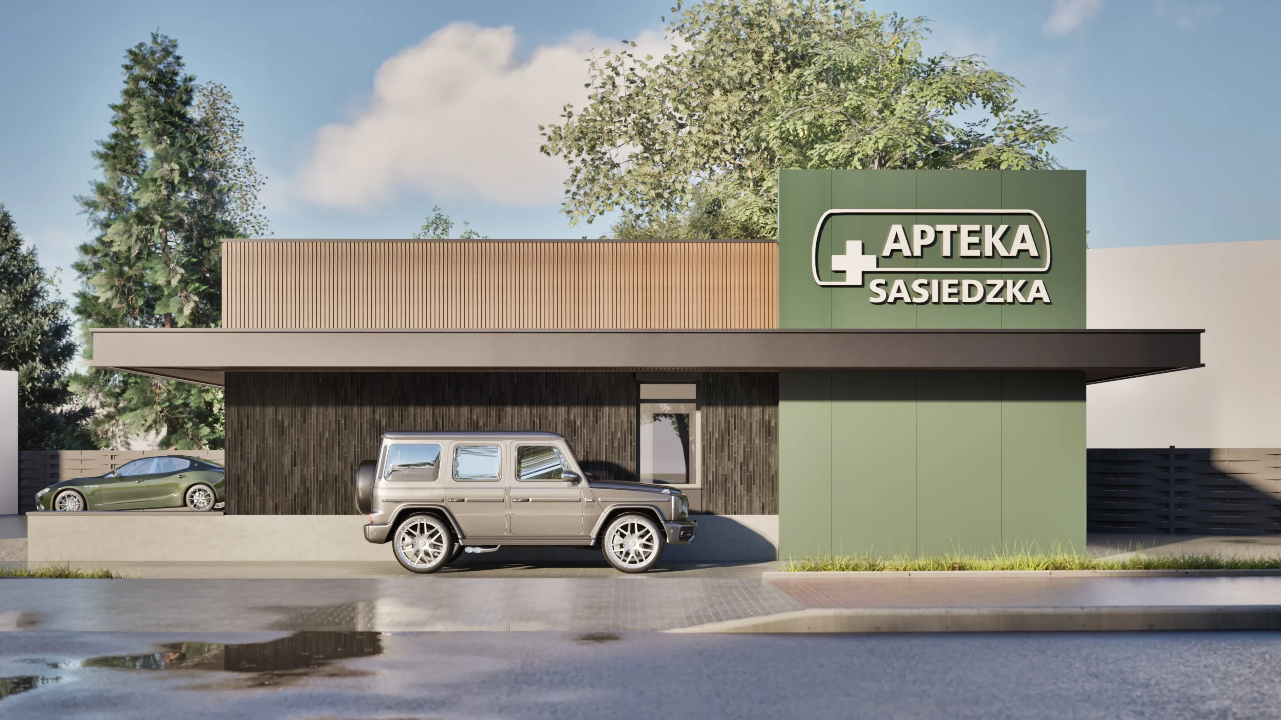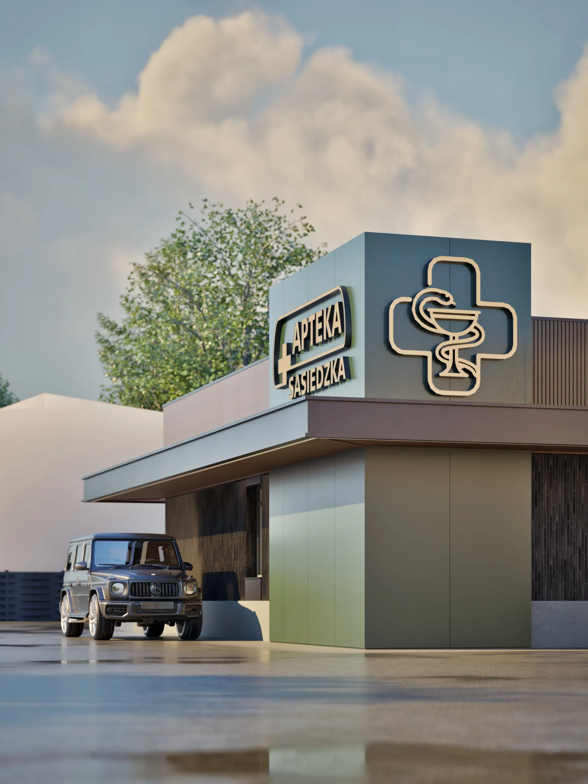 Koncepcja architektoniczna przebudowy istniejącego obiektu handlowego, która łączy funkcję apteki z usługą Drive-Thru, odpowiadając na potrzeby dynamicznego i wygodnego dostępu do leków. Projekt charakteryzuje się eleganckim minimalizmem i nowoczesnym brandingiem na elewacji, mającym za zadanie stworzenie przyjaznego i rozpoznawalnego punktu w strategicznej lokalizacji przy głównej drodze krajowej. Kluczowym założeniem było zaprojektowanie efektywnego obiektu komercyjnego, który jest jednocześnie wizytówką współczesnej opieki farmaceutycznej.