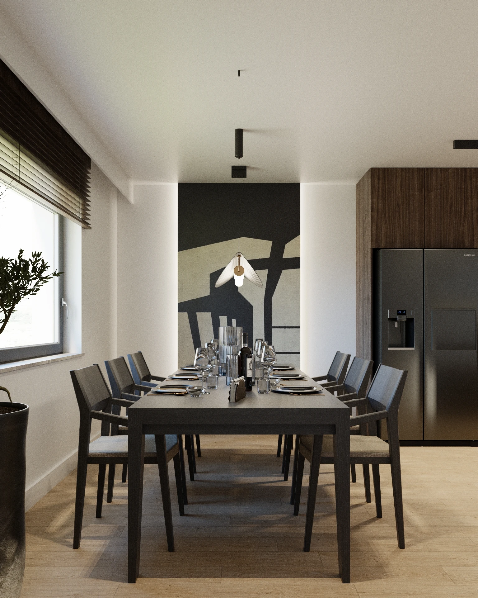 Zastosowanie ciemnych i jasnych tonów pozwala wydobyć głębię przestrzeni, a surowa geometria brył zestawiona z wyważonymi proporcjami daje poczucie harmonii. Koncepcja wpisuje się w naszą filozofię projektowania – estetyka to rezultat konsekwencji, a funkcja i forma muszą się uzupełniać. To wnętrze łączy użytkowość z wyrazistą tożsamością wizualną – eleganckie, oszczędne i zaprojektowane z myślą o długowieczności rozwiązań.