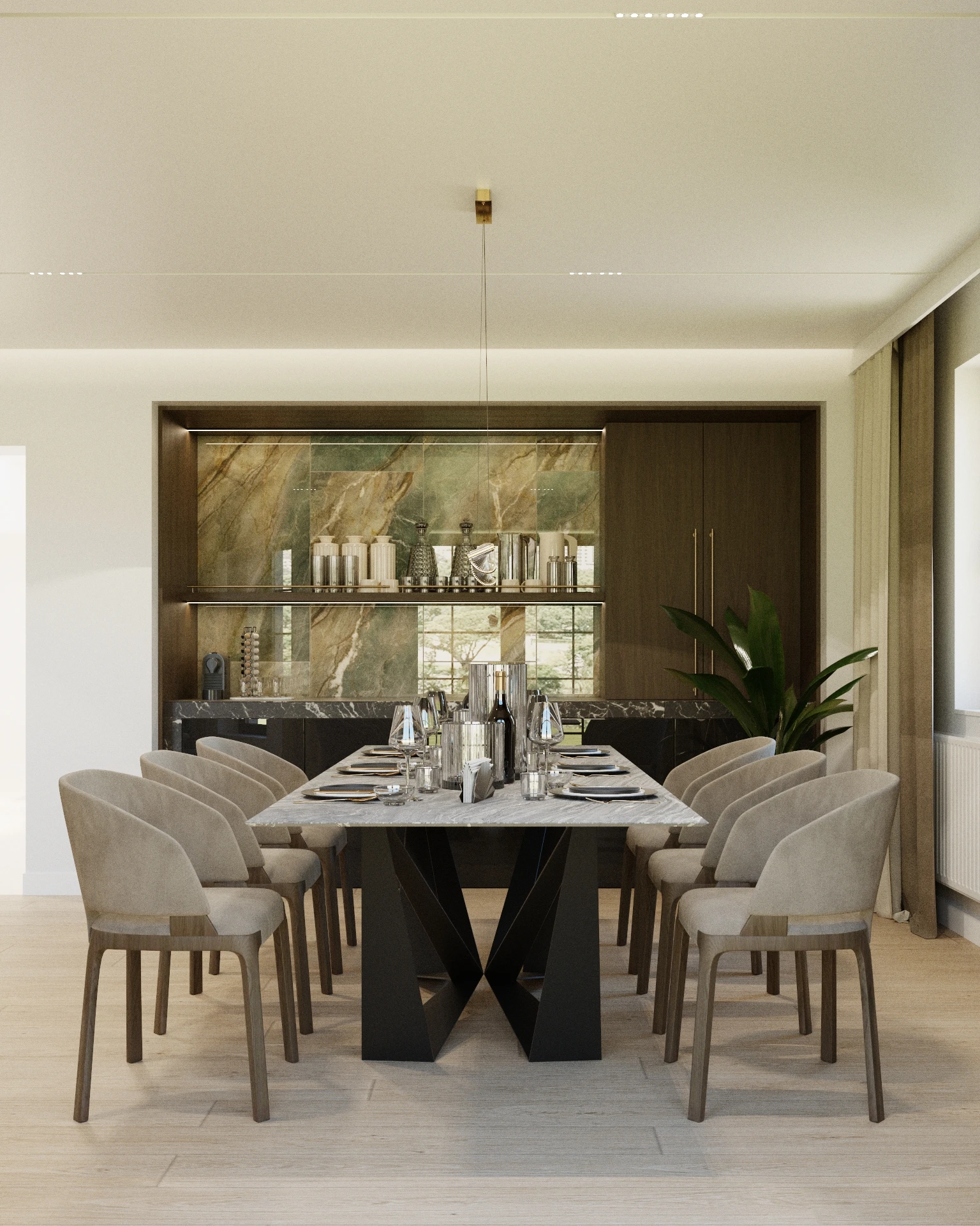 W projekcie dominują naturalne materiały — szlachetne drewno, wyraziste kamienie i wysokiej jakości tkaniny. Połączyliśmy ciepłe beże i brązy z ciemniejszymi akcentami, które dodają głębi i podkreślają elegancję. Detale o złotym wykończeniu wprowadzają subtelny luksus, a starannie dobrane oświetlenie eksponuje strukturę i kolor materiałów. Ta paleta tworzy przytulne, a jednocześnie nowoczesne wnętrze w duchu ponadczasowej klasy.