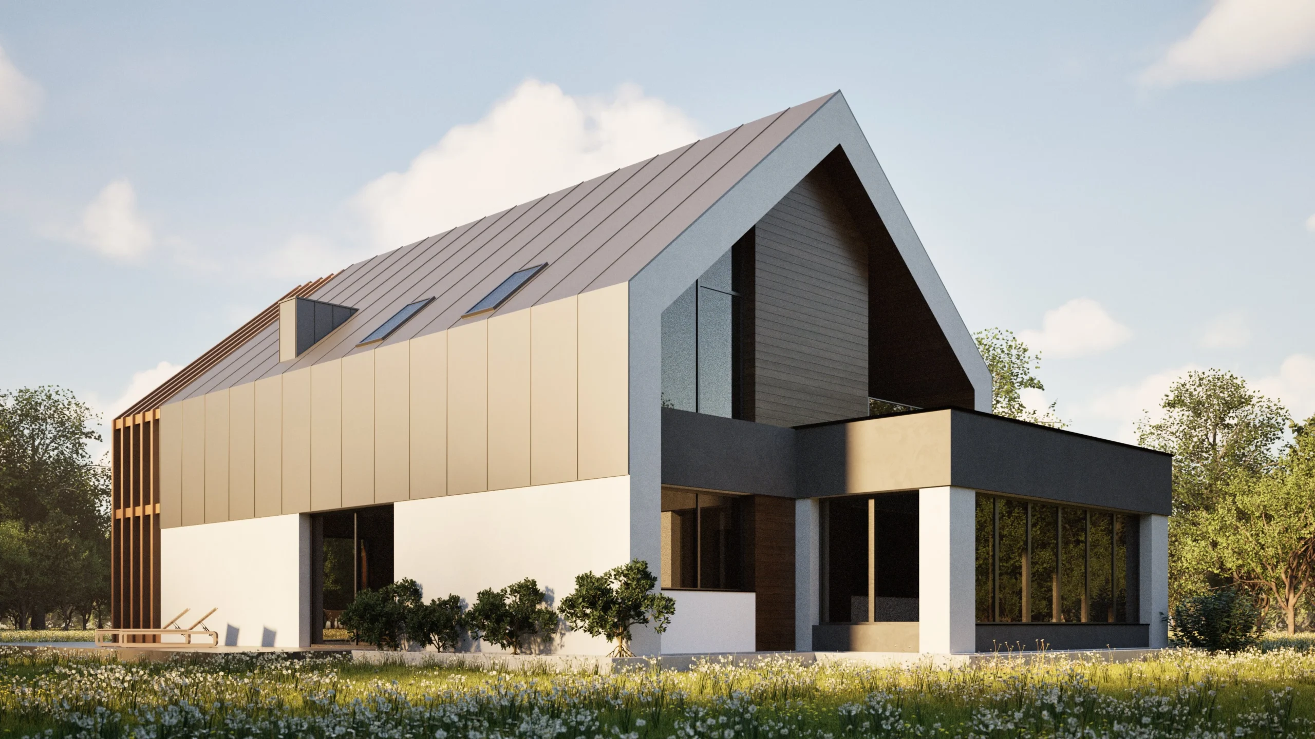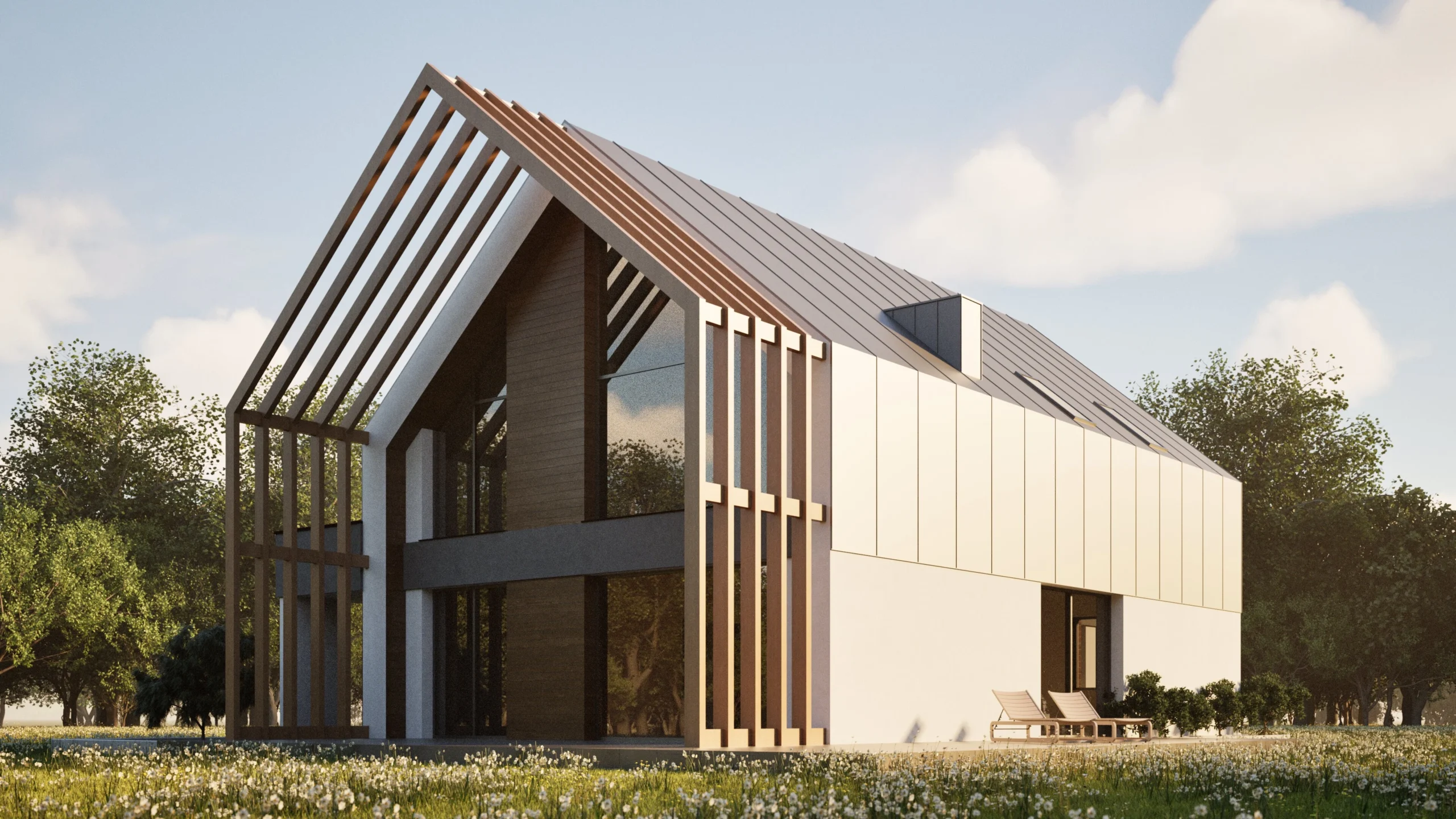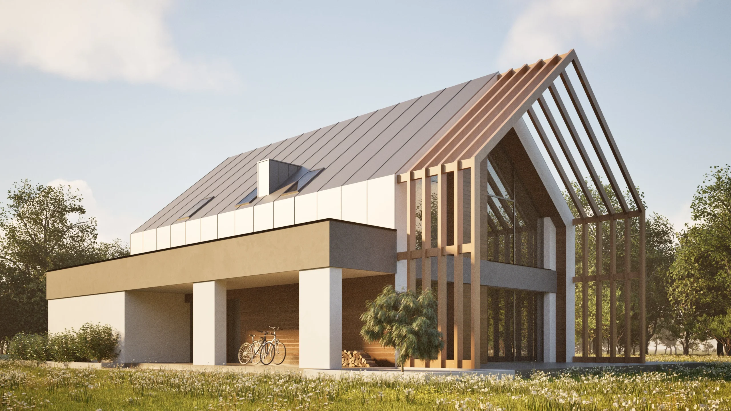 Projekt domu w Górze Siewierskiej to studium horyzontalnej kompozycji, która w sposób bezkompromisowy łączy nowoczesną architekturę z naturalnym kontekstem pól i lasów. Biała, podłużna bryła zintegrowana z ażurową pergolą oraz szklanym ogrodem zimowym tworzy dynamiczną, a zarazem harmonijną całość. Kluczem do sukcesu było tu zachowanie idealnych proporcji, które nadają budynkowi lekkości i wyjątkowego, modernistycznego charakteru.