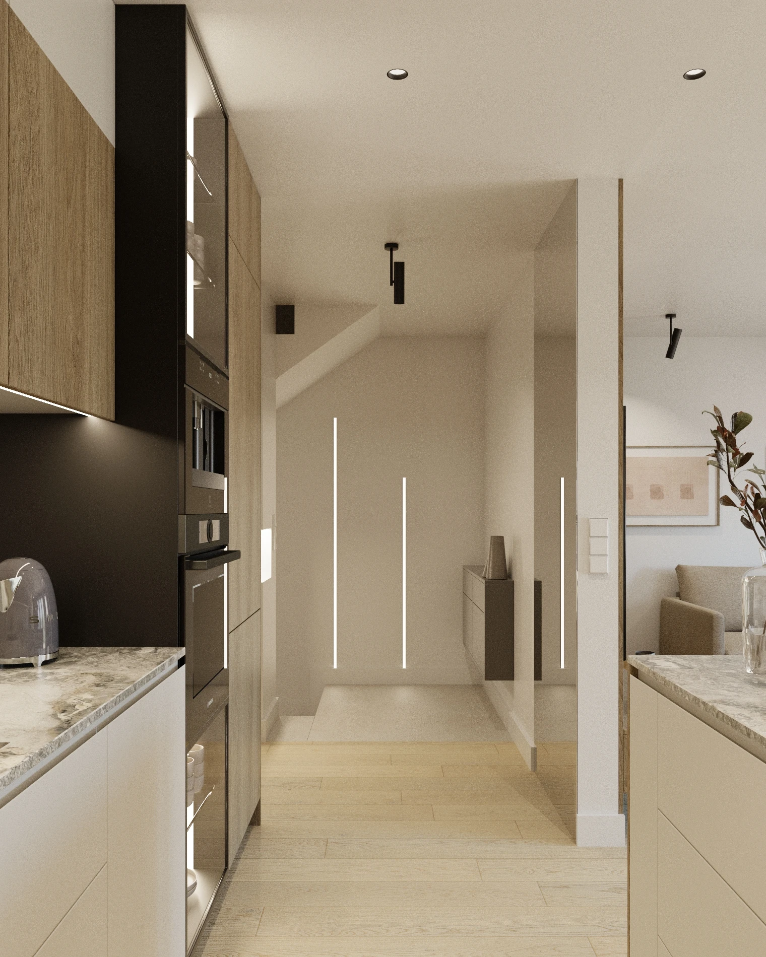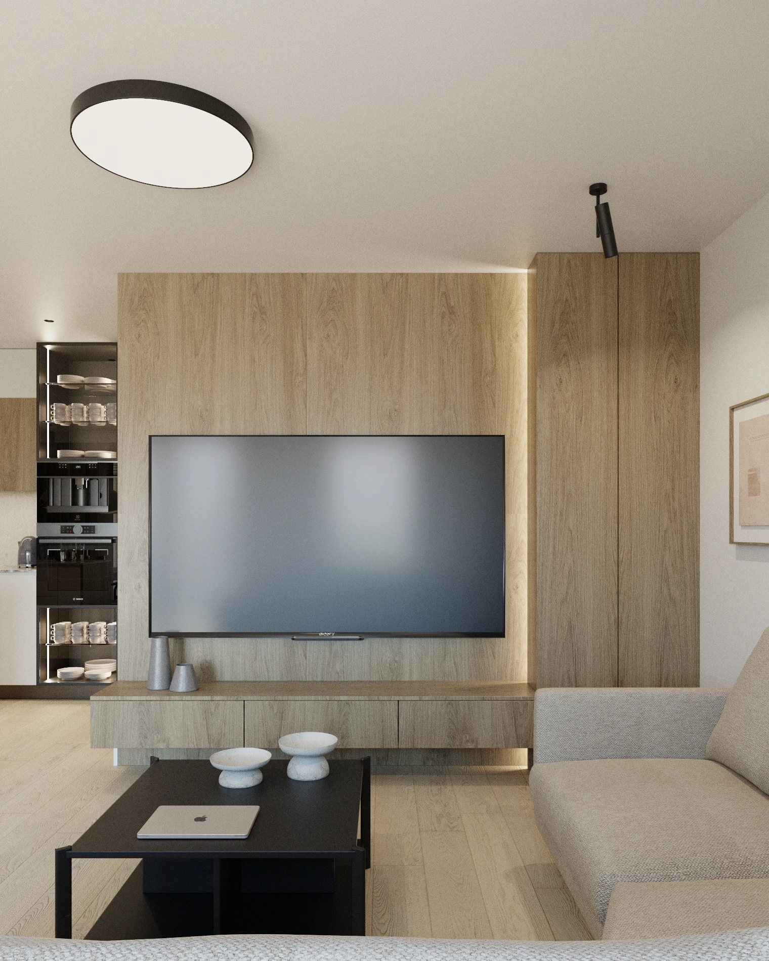 Motywem przewodnim projektu jest drewno w jasnych, ciepłych odcieniach, które pojawia się na podłogach, frontach meblowych i w postaci charakterystycznej zabudowy ściany RTV. Drewnianą bazę uzupełniają kamienne płytki o naturalnym rysunku oraz kaszmirowe i białe wykończenia zabudów, nadające wnętrzu miękkości. Nowoczesnego sznytu dodają czarne detale (ramki, uchwyty, lampy) oraz elementy szklane, w tym kluczowa dla projektu podświetlana witryna w kuchni, która stanowi elegancki akcent na wejściu.