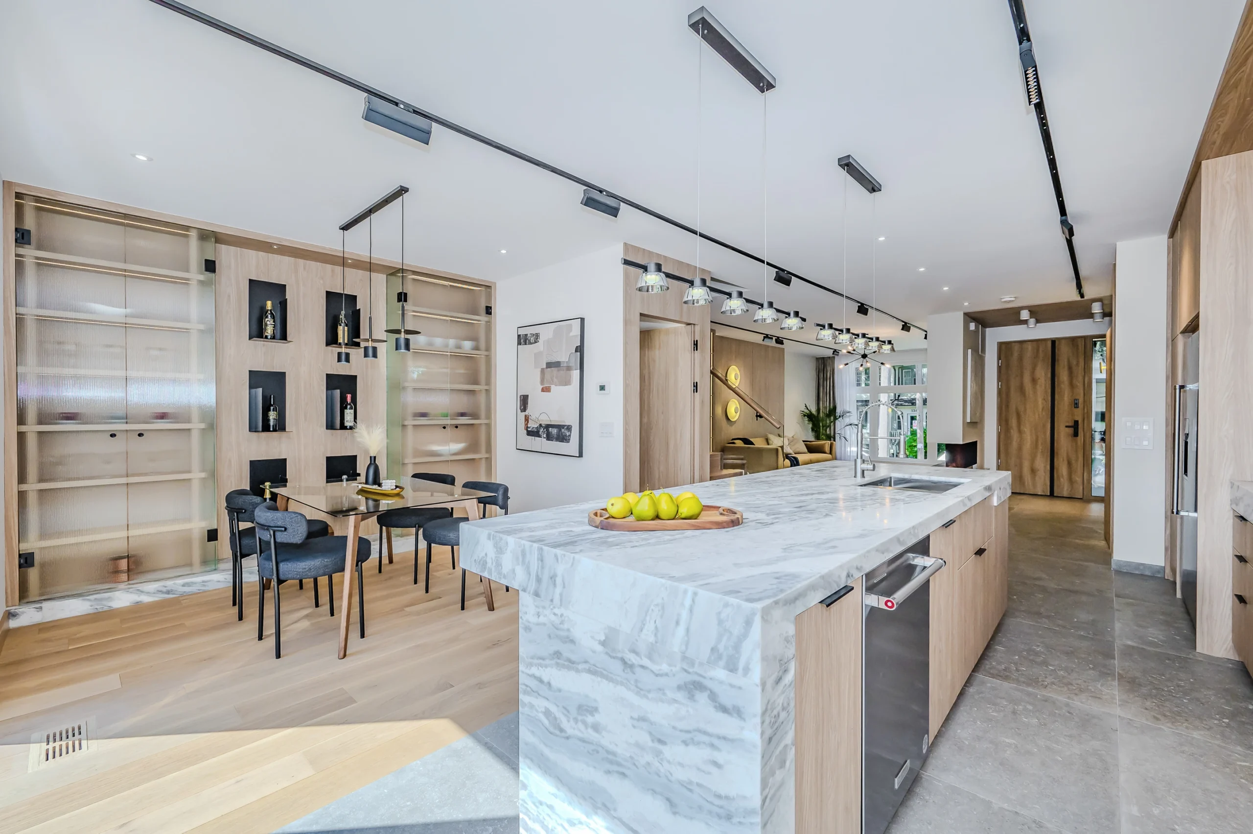 Postawiliśmy na materiały o wyrazistej fakturze: ciemne drewno na schodach i naturalne na meblach, szkło, płytki z kamiennymi wzorami, wysokiej jakości tekstylia. Zamiast krzykliwych kolorów — zastosowaliśmy naturalne materiały i subtelne różnice w fakturze, dzięki czemu światło i struktura budują klimat wnętrza. Drewno kontrastuje z jasnym tłem i lżejszymi wykończeniami, co nadaje przestrzeni głębi, ciepła i wyrafinowanego charakteru.