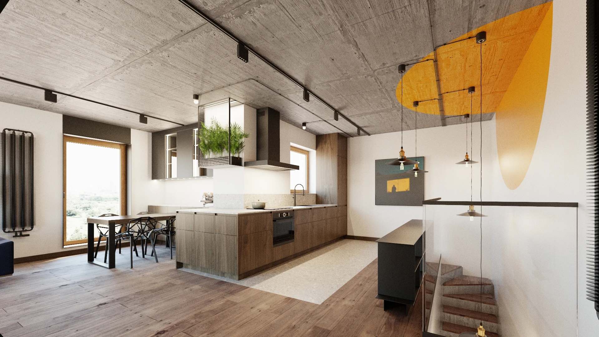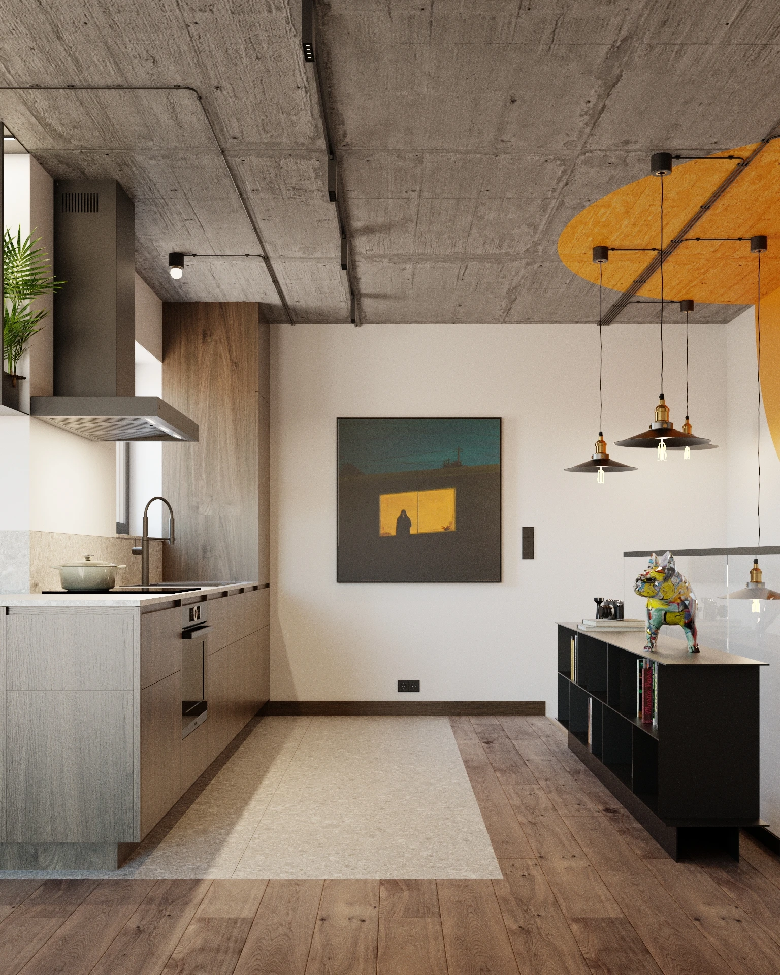 Balans: surowy beton w kontraście do przytulnego drewna i ciepłych barw.