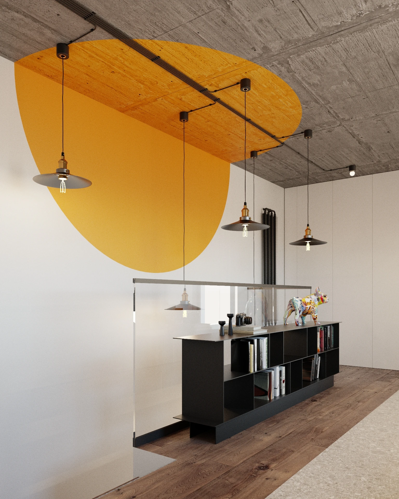 Mieszkanie zlokalizowane jest w zielonej dzielnicy Katowic, tuż przy lotnisku na Muchowcu, a czerpie z estetyki modern loft. Głównym aktorem jest tutaj surowy beton na stropach, którego struktura pojawia się też na ścianie RTV oraz jako wykończenie klatki schodowej. Surowość betonu została przełamana podłogą o klimacie rustykalnym, z mocno zarysowanym usłojeniem, co nadaje wnętrzu autentyczności. Dzięki rezygnacji ze zbędnych dekoracji, przestrzeń wydaje się czysta, uporządkowana i niezwykle funkcjonalna – dekoracje mają tutaj inny charakter.