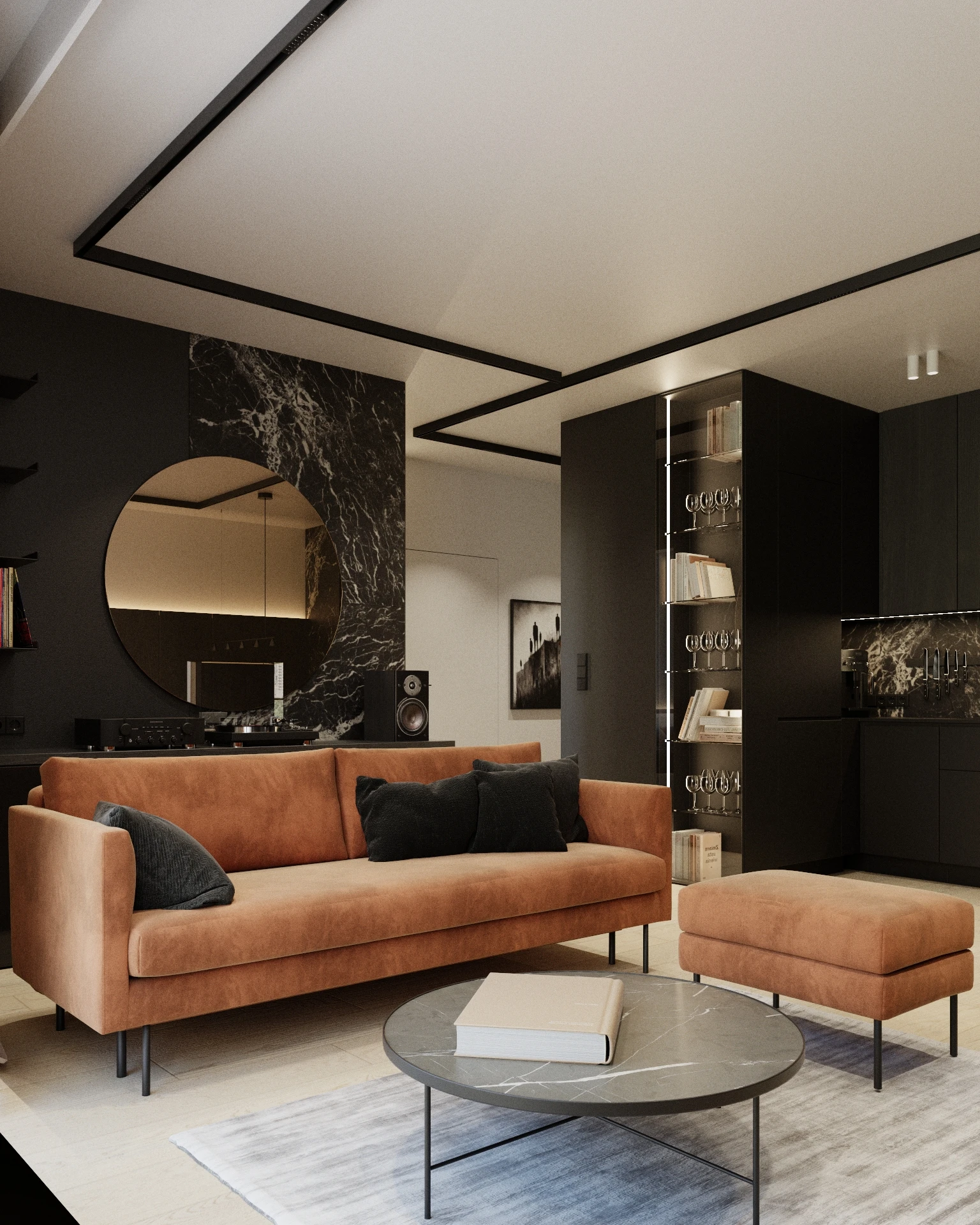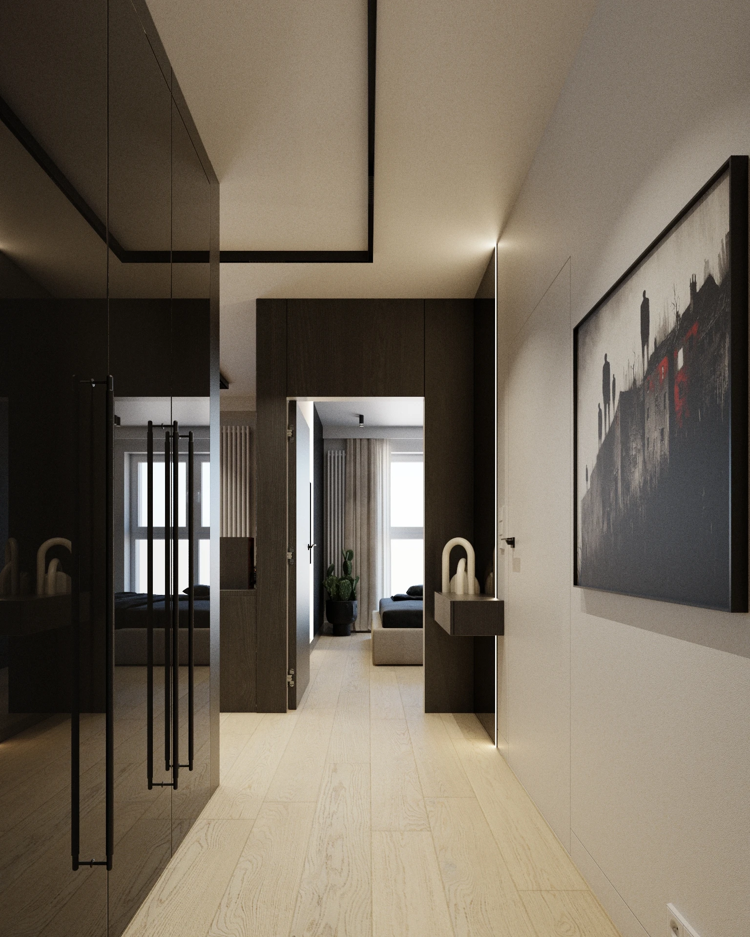 Śródmiejska zabudowa nie oferuje wiele światła dziennego, szczególnie w mieszkaniach o niewielkim metrażu. Wstępnym założeniem było rozświetlenie mieszkania poprzez zastosowanie zabiegów polegających na odbijaniu światła z okien. A to wszystko przy ciemnej i zdecydowanej kolorystyce materiałów wykończeniowych mebli, ścian.