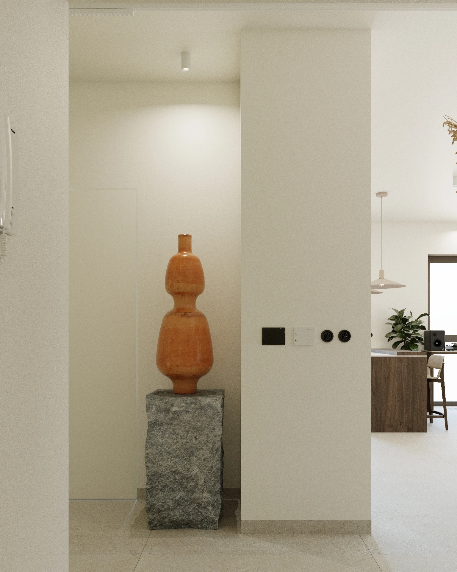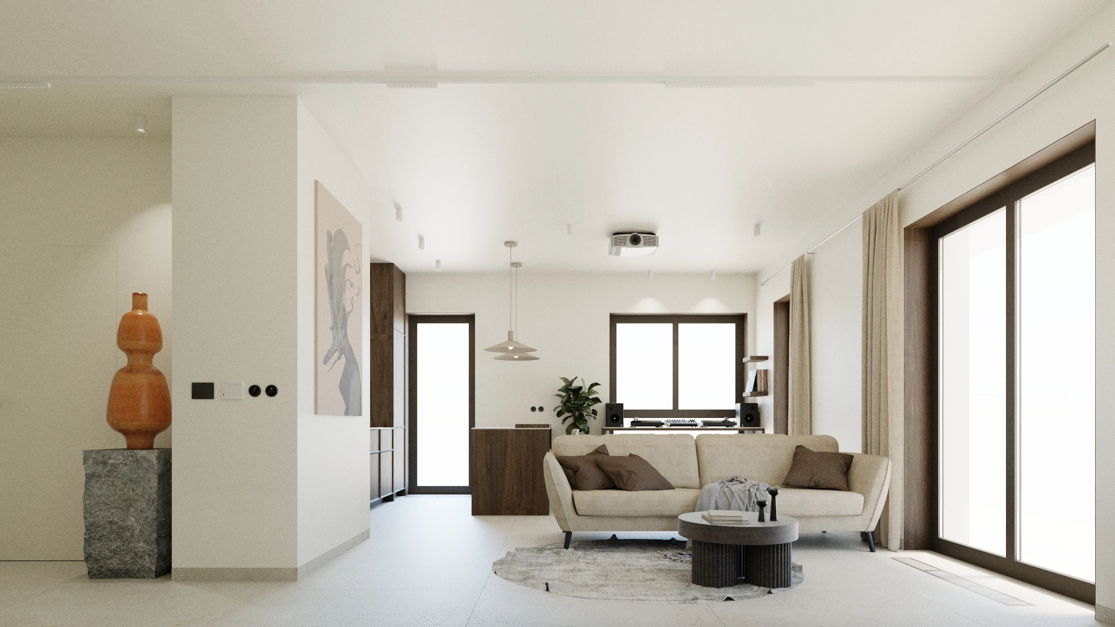 Koncepcja wnętrza opiera się na maksymalnym uproszczeniu formy, aby ustąpić miejsca pasjom i twórczości mieszkańców. Stylistyka opiera się na grze faktur i światłocienia, rezygnując z krzykliwych kolorów na rzecz szlachetnej palety bieli, beżów i naturalnego drewna. Mieszkanie zostało zaprojektowane jako prywatna galeria, w której każda rzeźba, obraz czy instrument ma swoje zdefiniowane miejsce, a prawie niewidoczne oświetlenie w formie tub i szynoprzewodów buduje nastrój bez naruszania harmonii sufitu.