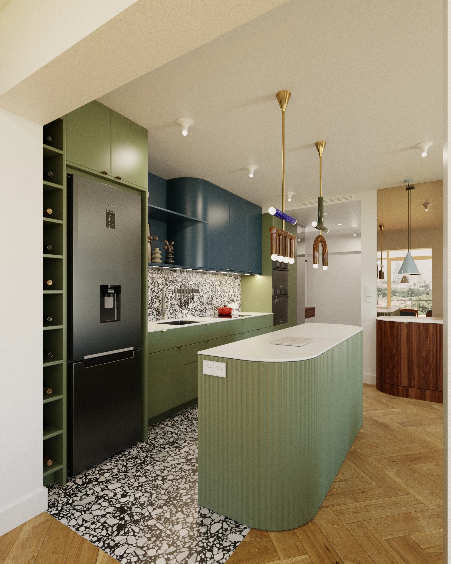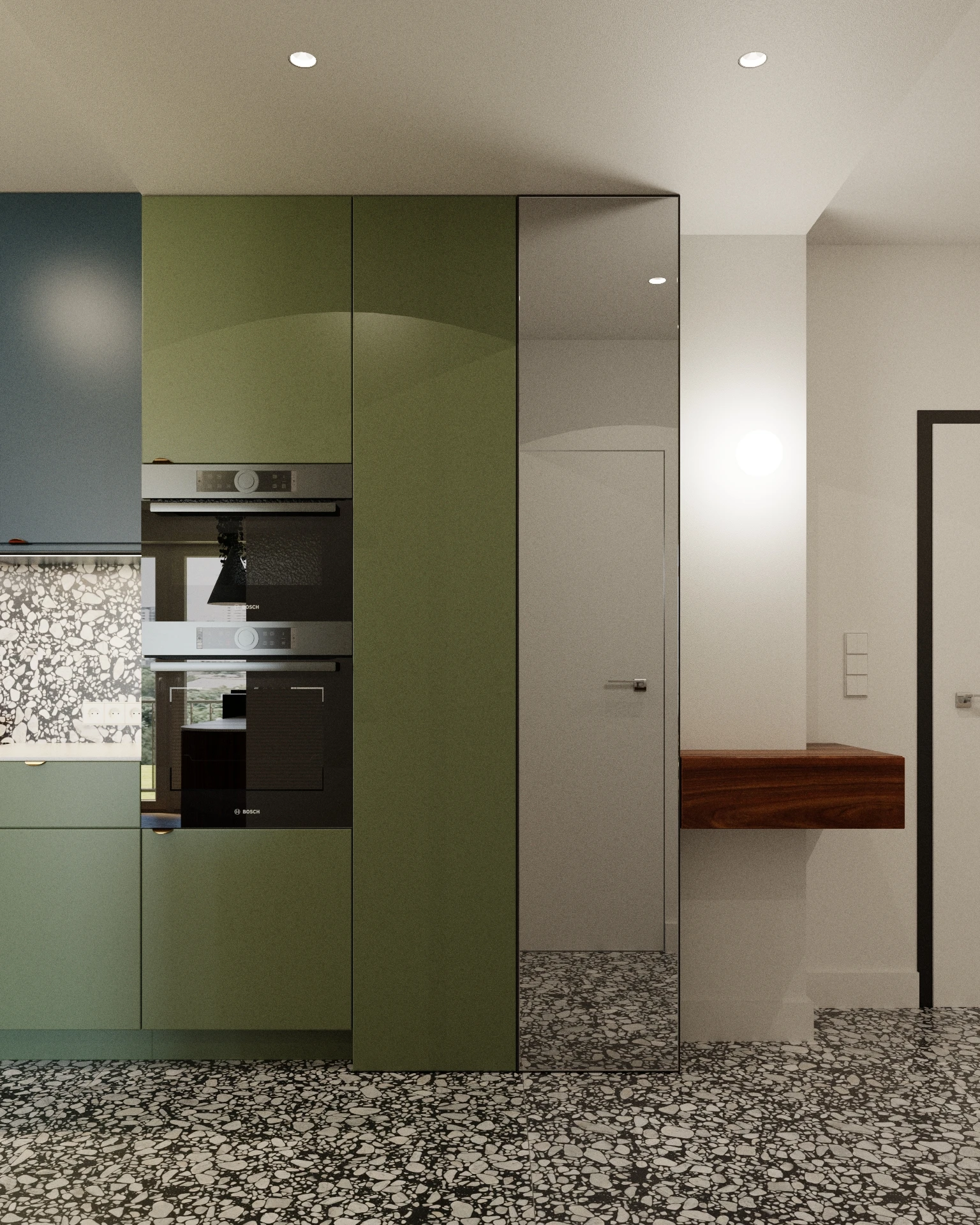 Energetyczne i wyraziste wnętrze zaprojektowane dla młodych, aktywnych mieszkańców, które zręcznie łączy minimalistyczną bazę z odważnymi akcentami lastryko i głębokich kolorów. Głównym założeniem było stworzenie maksymalnie ergonomicznej przestrzeni, zdolnej pomieścić pasje (rowery, książki, sztukę) i potrzeby pracy zdalnej, bez rezygnacji z wysokiego standardu estetycznego. Całość jest studium funkcjonalności i barw, tworząc prywatną enklawę na parterze z dostępem do ogrodu.