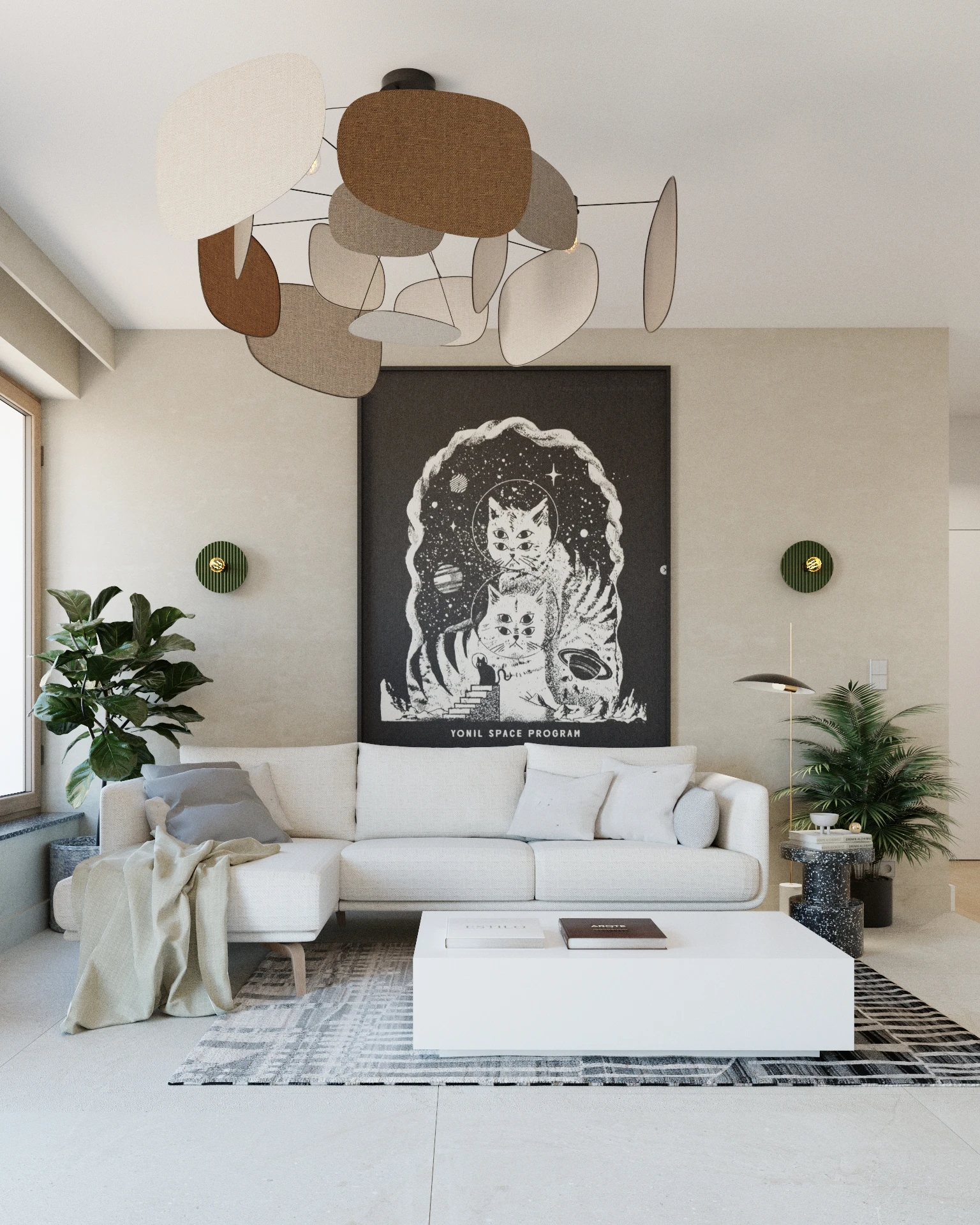 Głównym założeniem projektu było stworzenie wnętrza kojącego i spójnego, w którym granice między pomieszczeniami zacierają się dzięki powtarzalności materiałów. Stylistyka opiera się na stylistyce japadni urozmaiconej – dominują tu proste formy złamane w niektórych miejscach zaobleniami. Zamiast krzykliwych kolorów, postawiliśmy na pastele i głębię materiałów: od naturalnie wyglądających płytek po tekstylne wykończenia ścian. Efektem jest nowoczesna „oaza spokoju” w sercu tętniącej życiem Warszawy.