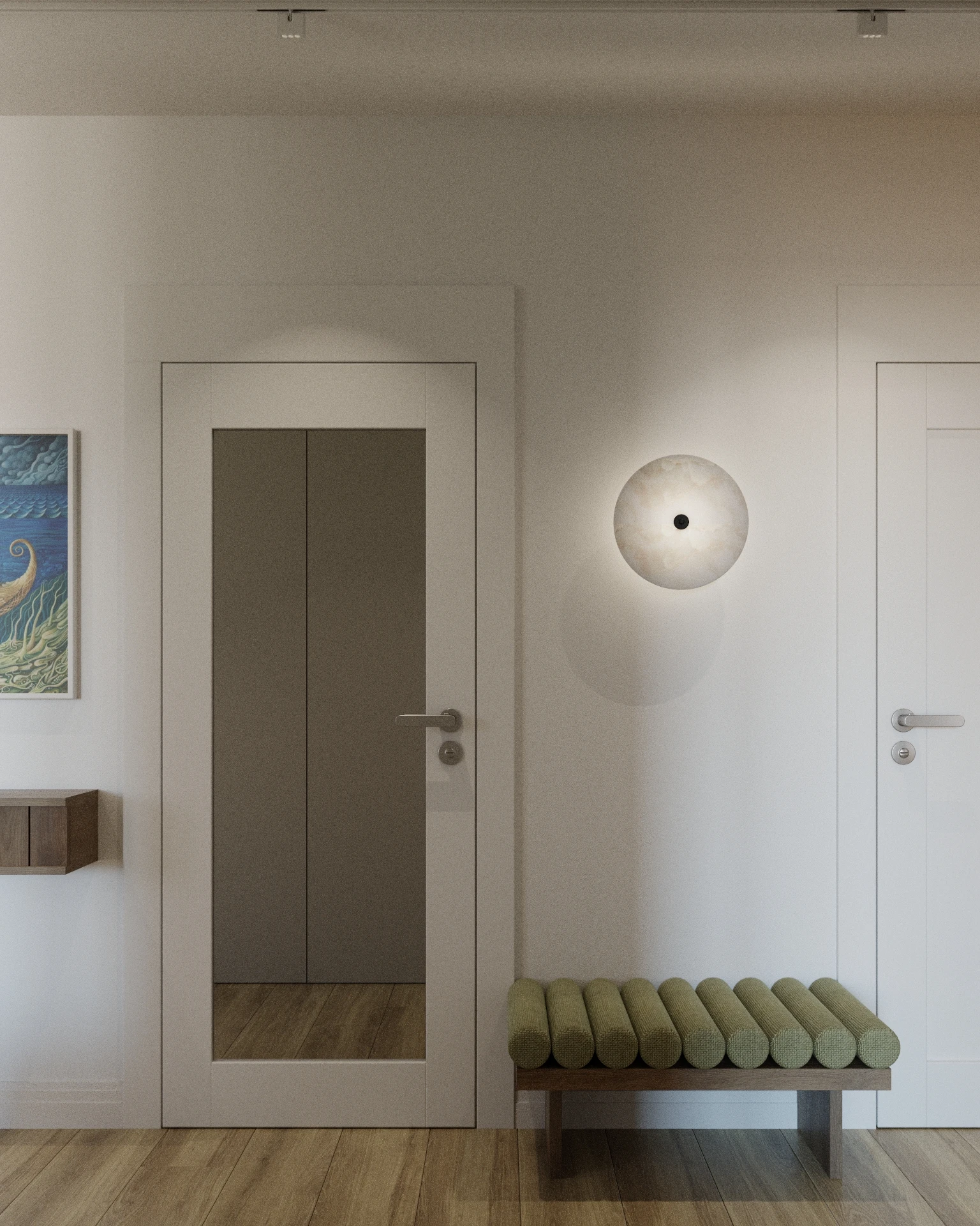 Postawiliśmy na naturalne, ciepłe materiały: drewno w odcieniu orzecha, tapicerowane panele w sypialni, miękkie tkaniny i neutralne beże przełamane oliwkową zielenią. Kamień w kuchni i klasyczne wykończenia dodają ponadczasowości, a nowe oświetlenie podkreśla strukturę powierzchni.